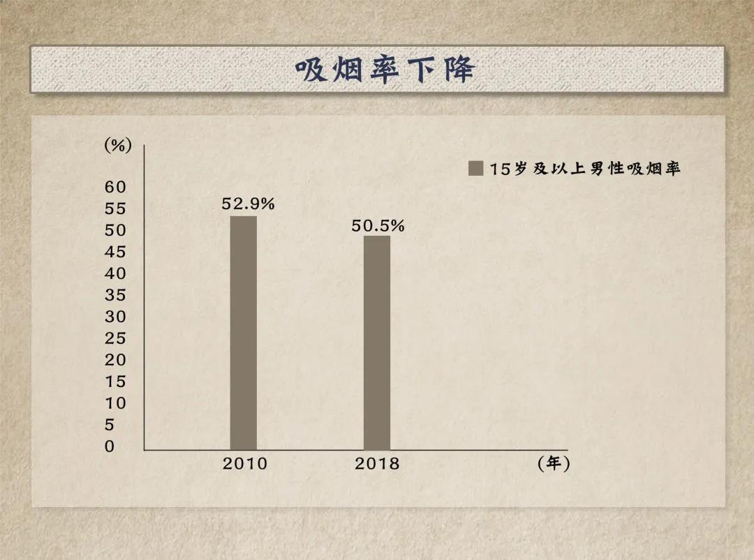 2010年至2018年,中國15歲及以上人群吸煙率呈下降趨勢(shì),其中男性從52.9%降至50.5%。2018年,86.0%的人認(rèn)為吸煙會(huì)引起嚴(yán)重疾病。