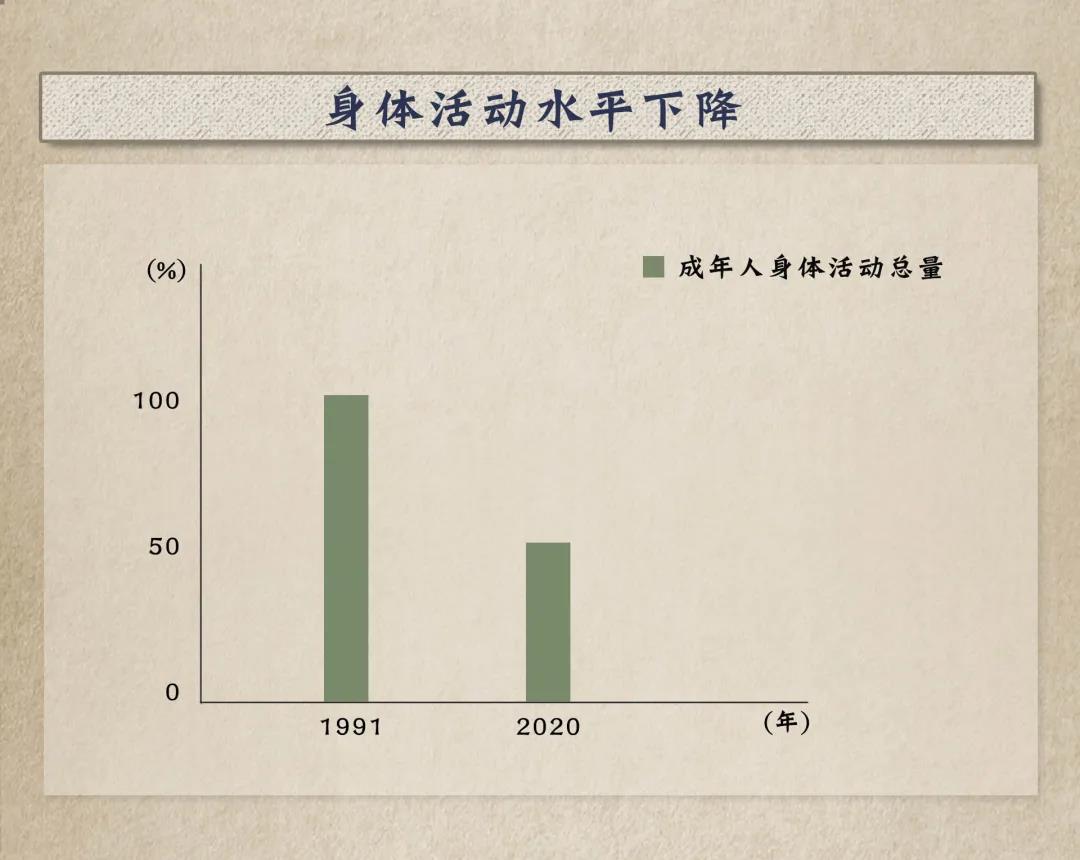 中國居民總身體活動(dòng)量與心血管病死亡呈顯著負(fù)關(guān)聯(lián)。1991年至目前,成年人身體活動(dòng)總量下降近一半。