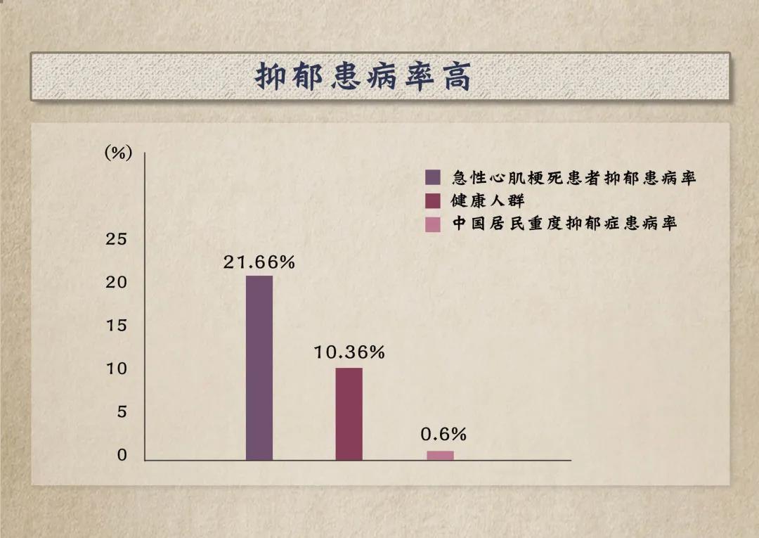 中國急性心肌梗死患者抑郁患病率為21.66%,明顯高于健康人群的10.36%。中國居民重度抑郁癥患病率為0.6%,重度抑郁癥是心臟病的危險(xiǎn)因素之一。