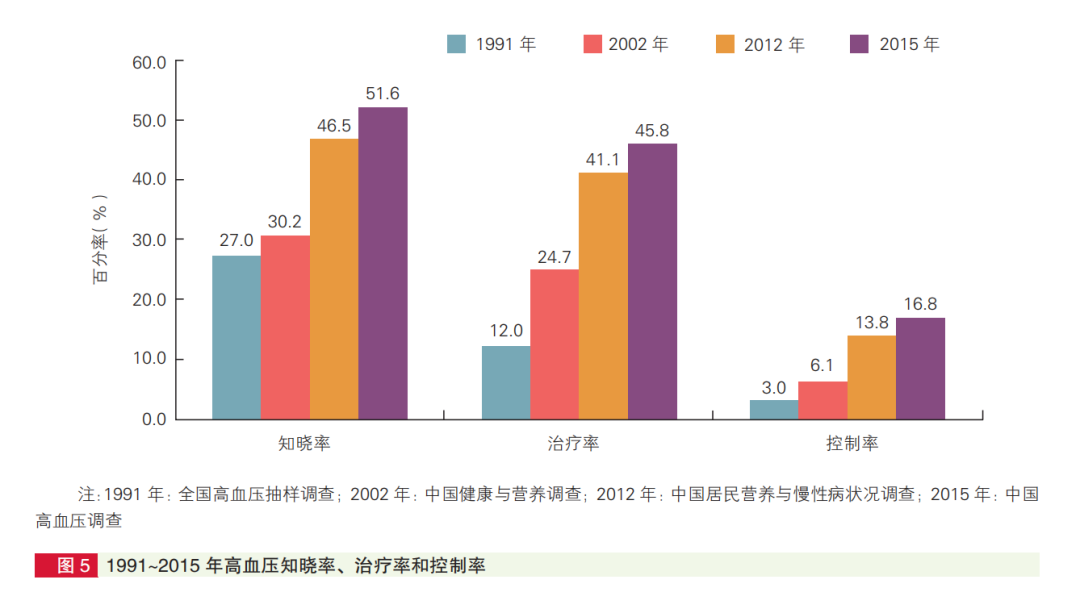 近年來,高血壓的知曉率、治療率和控制率呈現(xiàn)出持續(xù)增長趨勢(shì)。知曉率從1991年的27%升至2015年的51.6%,同期治療率從12.0%升至45.8%,控制率從3.0%升至16.8%。