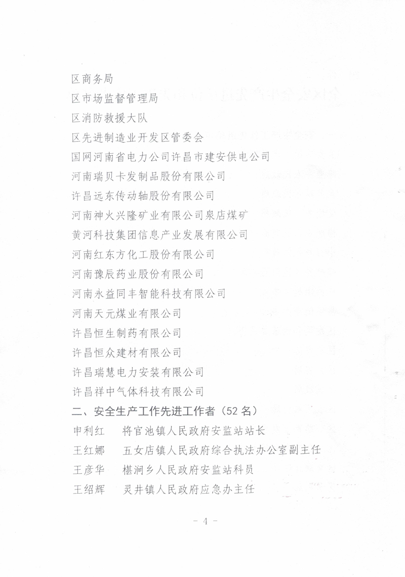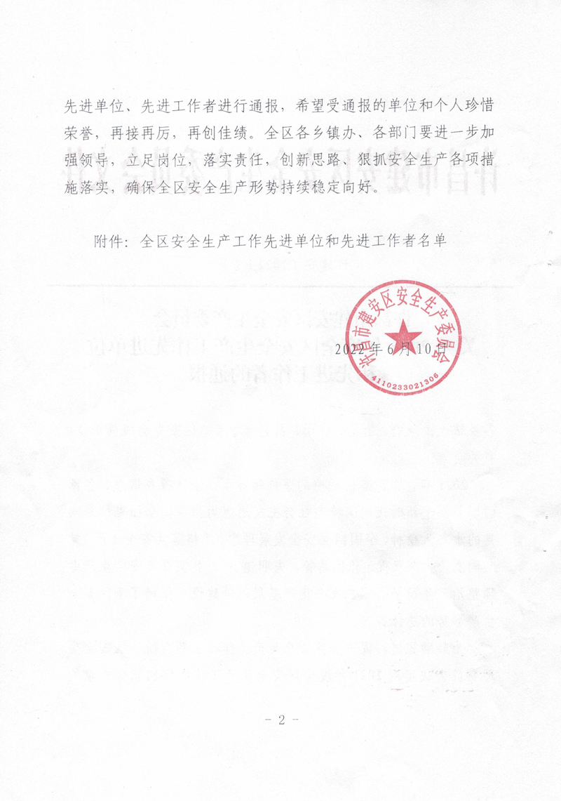 2021年,我公司以習近平新時代中國特色社會主義思想為指導,全面貫徹落實黨的十九大精神,牢固樹立安全發展理念,嚴格落實安全生產“黨政同責、一崗雙責、齊抓共管、失職追責”,狠抓安全生產基層基礎建設,排除潛在的安全隱患,保持了廠區安全生產形勢的總體穩定。故許昌市建安區安全生產委員會對我公司在2021年度安全生產工作中的積極貢獻進行了表彰,授予于“全區安全生產工作先進單位”稱號。